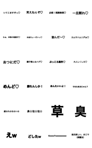 いてこます/笑えねぇぞ/既読無視/黙れ/鼻塩塩/馬鹿/お金ちょーだい/詰んだ/カムサハムニダ/おつにだ/むり/草/臭調子乗んな/盛れない/彼氏欲しい