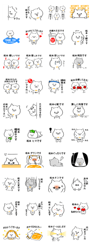 名字(苗字)松本(まつもと)さんが使うネコの名前スタンプです。仕事仲間にも使えるように敬語・ですます調になっています。40個スタンプです。