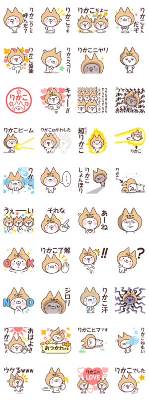 りかこさん、りかこちゃんが使える名前スタンプです。リカコ/理香子/里佳子/梨夏子/莉佳子/璃花子/梨香子/璃香子/里花子/梨華子さんは是非どうぞ。