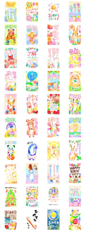 明るくきれいな水彩の動物たちが、ポストカード風BIGスタンプになりました。大切な人へ、気持ちを届けたい時に。感謝の言葉多めです。誕生日カード・年賀状もあります♪ ※このスタンプはトークルームで大きく表示されるBIGスタンプです。ようこ より発売