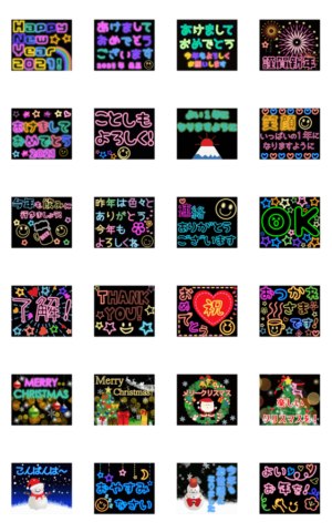 2021年リニューアル版です。送る相手の画面がどんな色でも見やすい黒背景にピカピカのネオン。クリスマスやお正月の年賀状代わりの挨拶、日常使える言葉をセットにしましたmtorak より発売