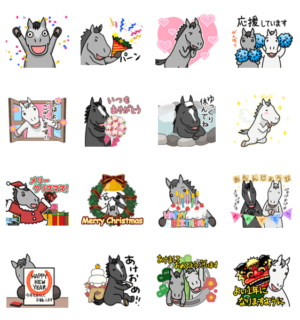 芦毛のお馬さんのポップアップスタンプです。特別なときに使える「おめでとう」が多めのスタンプになっています。