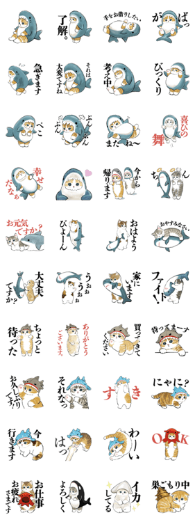 サメを被った猫が中心です。感情系のスタンプが多いので様々なタイミングで使えます。