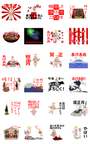 エンジェルの新年用ポップアップスタンプバージョン。おせち料理,お雑煮,花火,賀正,鏡餅,餅つき,富士山,丑年,合格祈願,羽子板,北斎等色々ごちゃごちゃはいってます。