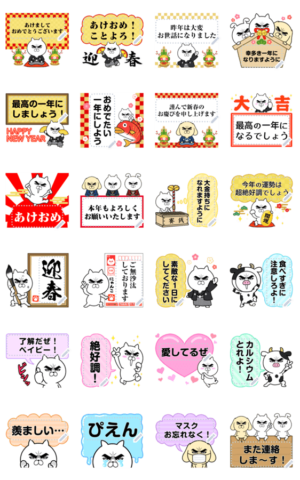 目ヂカラ☆にゃんこのお正月メッセージ スタンプに書いてある文字一覧