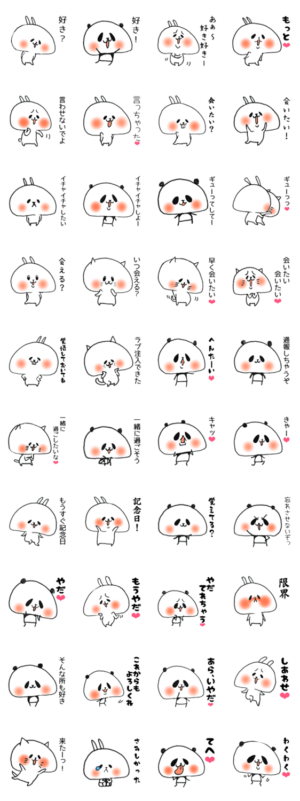 ゆるウーウサギ、猫、パンダの嬉しい恥ずかしい乙女なスタンプです。好き、キャッキャー伝えたい時にどうぞ。文字の周りを白ふちどりしているので暗い背景でも使えます。ちくない より発売