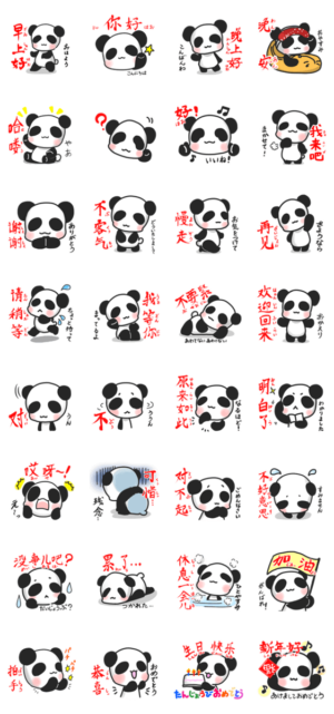 日常で使える可愛いパンダの中国語スタンプ。ひらがなの読み方と日本語付きで便利。中国語学習や日本語学習にもオススメ。