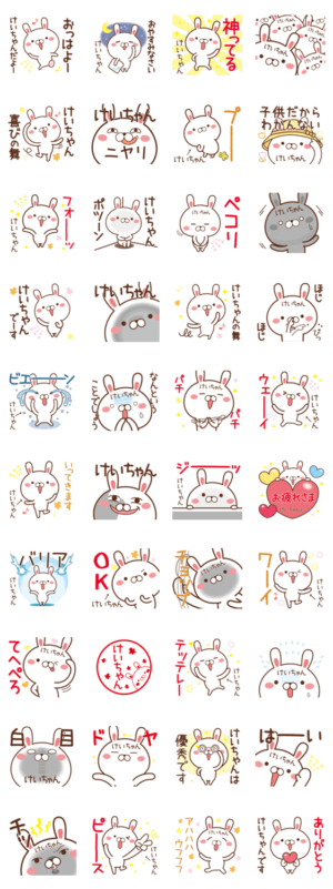 けいちゃんが使うスタンプ。けいこ,けいすけ,けいた,,景子,佳子,慶子,恵子,啓子,圭子,敬子,桂子,京子などけいちゃんやけいくんが使うけいがつく人専用スタンプです