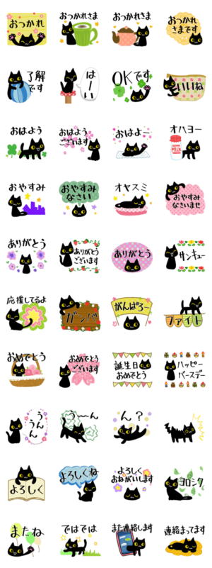 大人かわいい黒ネコの使いやすい挨拶とあいづちのスタンプ。春っぽいパステルカラーが多め♡水玉柄やしましまが好きな人注目!株式会社KSF より発売