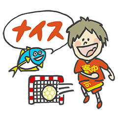 ハンぎょボール&春の全国中学生ハンドボール選手権大会のスタンプ。富山県氷見市の名産「ブリ」と少年の掛け合いがほっこり。氷見弁も思わず使いたーなるちゃ。氷見市ハンドボールを核としたまちおこし推進協議会 より発売