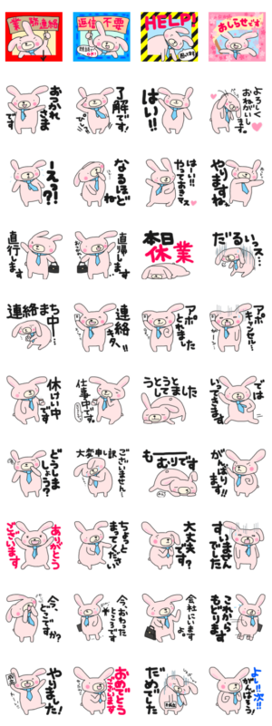 太っちょ営業マンのうさまる。保険屋さんなど外回りの営業のサラリーマンが使いやすいスタンプ。敬語なので仕事仲間や先輩にも使えるよ。