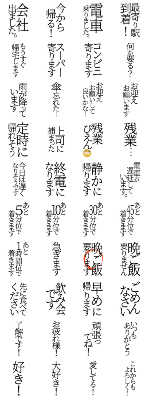 タップするだけで手軽に送れる夫婦連絡スタンプ。報連相が面倒くさい相方でもめんどくさがりな相方でも気軽に共有★