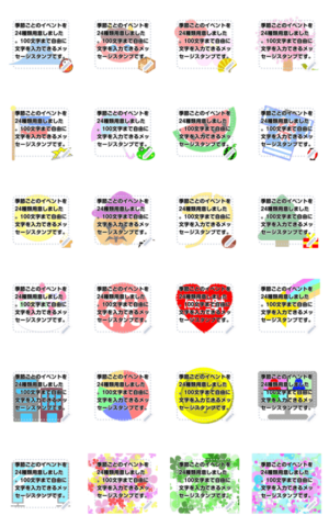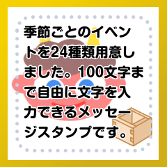 1月から12月まで季節のメッセージスタンプ。正月、節分、お花見、ハロウィン、クリスマスなど。アクリル板やテレビ会議も追加しました。 #誕生日 現在この商品は一部のスマートフォン版LINE 10.3.0以上のトークルームでのみ使用できます。動作環境の最新情報はヘルプをご確認ください。みやや より発売