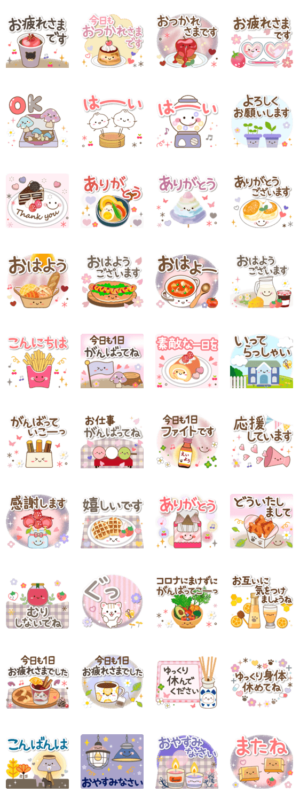 ほっこリとしたタッチで描かれた美味しそうなスタンプが一杯あって、相手の食欲を誘ってしまいそうでもあります。