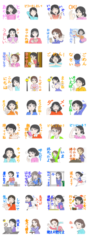 基本的なあいさつのほか、「急用が入った」「あとで連絡します」「食べて帰る」など、取り急ぎ送りたいコメントなどを、色鉛筆で描いた女性が送る癒し系スタンプ。
