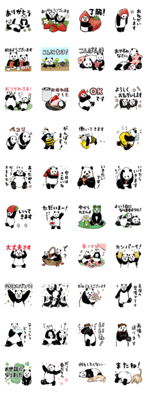 てきとーパンダのスタンプ第15弾。いちごがいっぱいの春バージョン。ちょっとリアルなパンダのスタンプです。
