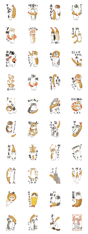 エビを被ったり、巻いたり、抱えたり。シュールなにゃんこの普段使える(?)スタンプです。 ※このスタンプはトークルームで大きく表示されるBIGスタンプです。