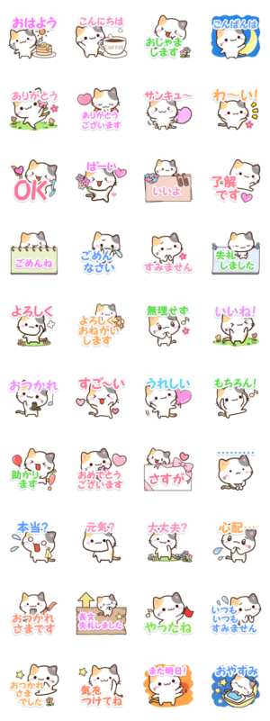 『小さい三毛猫』スタンプの【花文字】編になります。明るい、カラフルな花の色の文字と、三毛猫で、丁寧に可愛く返事ができます。ねこ好きな方にぜひ。【かたこ】かたこ より発売