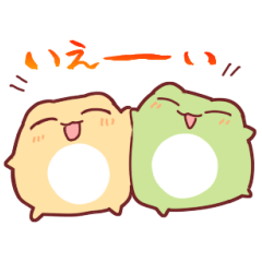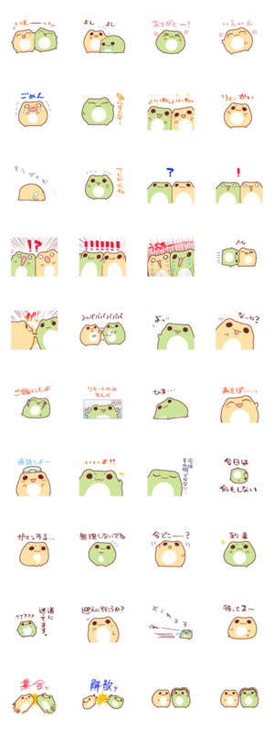 ころころとした大福のようなカエルのスタンプです。お友達のきなこが登場です。友達と使い合える内容のスタンプになっています。