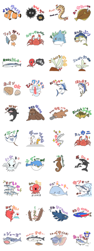 海や川の生き物や魚をダジャレに取り入れたスタンプです。日常に使うスタンプが50コイン(120円)で盛り沢山となってます。