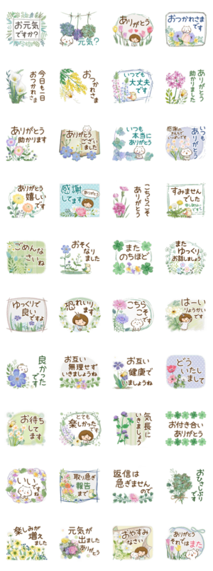 大人対応に便利な丁寧語とお花がいっぱい。イラストの色合いも控えめにしました。毎日使える便利なスタンプ。女の子と白猫シリーズ、他にも販売中です。よつばらんど