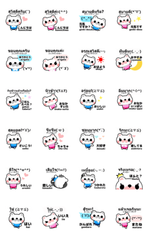 かわいいクマの動くタイ語スタンプ。タイ語の基本的なあいさつや返事を入れました。かわいい顔文字つき。