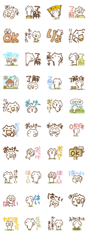 了解・おっけー・OK・承知しました・らじゃー・分かりました・かしこまりました。相手に合わせて使い分け。みんなに使えるから便利です。でか文字でねこの動きも可愛いよ