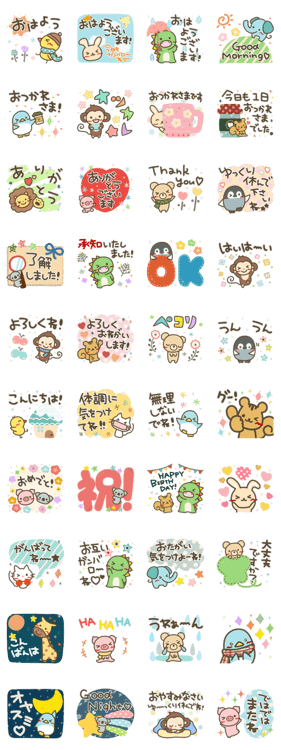 ゆるい絵柄で気軽に毎日使える大人かわいい動物スタンプの4です。日常的な言葉は敬語を含め、いくつかのパターンを収録◎明るくポップなデザインの基本セットです♪rinko より発売