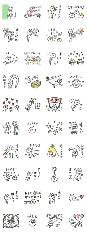 シュッとスリムな猫たちの毎日使えるスタンプです。基本の挨拶多め。日常でよく使う言葉がたくさん入っています!OTOBOOK より発売