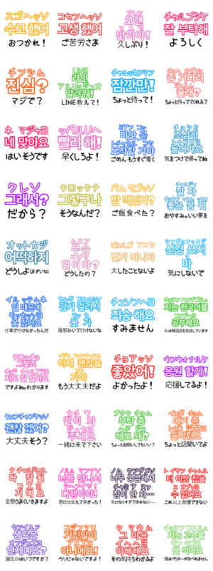 韓国語喋りたい人の為のスタンプ第二弾。頻出フレーズを詰めました。韓国語学習者もK-POP好きも使って覚えて話そう!韓国/ハングル