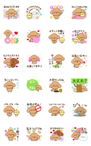 トイプードルのプーちゃんのスタンプです。励ましたり、応援したり、大事な人をふわふわもこもこ癒します。