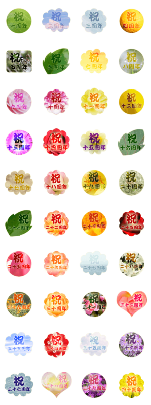 結婚記念日、カップル(恋人達)の付き合った記念日、開店、開業、イベントなど1周年から40周年まで記念日に毎年使えるセットです。花や空の写真付。お祝いしたい時に。うどんみかん より発売