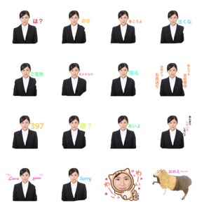 スーツ姿で綺麗めな女性をポイントにカラフルな単語でスタンプが作られていて