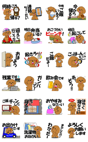 トイプードルのアニメーションが画面に大きく飛び出します。 今回は家族連絡用のスタンプですヒサケイプリン より発売