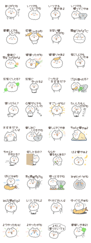 離れて暮らす家族や友達に名古屋弁で伝えよう!地元最高!海老フライとコアラも参加!飽きのこない便利なふわふわ白わんこ。あいうえお順配置で探しやすい!よつばらんど