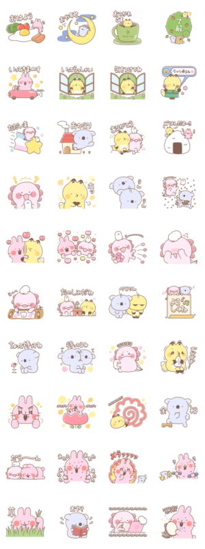 ひだまり荘のみんなの、あいさつ言葉が入ったスタンプです。ウサギのハルちゃん、キツネのムクくん、ウーパールーパーのウパさん、コアラは一緒に住んでいます。