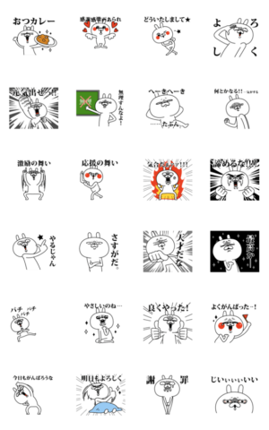 思いやりすぎて凄い顔になってしまったウサギです!応援、励まし、褒め言葉が多めなので面白いのにちょっとした気づかいのできる、意外とやさしいスタンプ♪