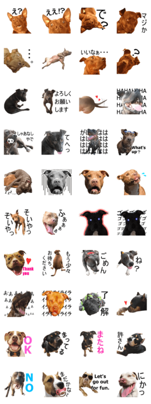 Pitbullのスタンプです。 イブ、家康、大和、うずら、ブルボン、サンタ、ルーク、七緒、リリー、DRE、弁慶、ルアナ、うずら!個性豊かなピットたち!うに より発売