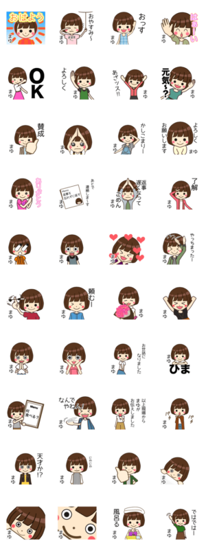 まゆさんの名前入りスタンプ。 髪型が同じ「かーいって言いたいだけのスタンプ4」発売中べるうっど より発売