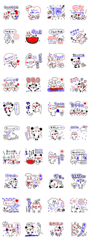 3色ボールペン12作目は、パンダやくま、ネコ、うさぎ、ブタ、ひよこ達の夏バージョン♪まるでノートの隅っこに落書きしたようなスタンプです【たかせゆづき】スタンプたかせ ゆづき より発売