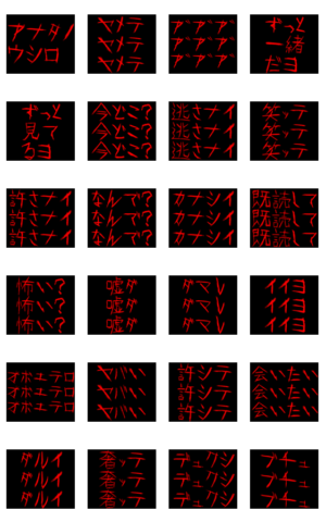 トーク画面にとびだすポップアップスタンプです。友人や家族に恐怖を感じさせることができます。メンヘラ/怖い/だるい/嘘だ/既読して/ずっと/見てるよ/奢って/煽りヤンデレ