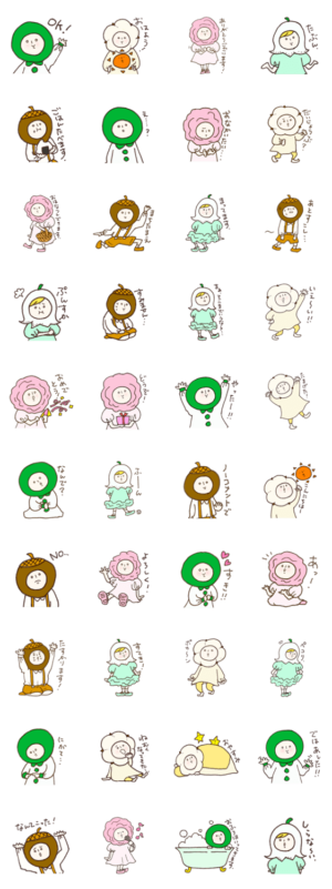 マリモ、カーネーション、どんぐり、スズラン、コットンたちのようせいスタンプです。ピエールナガノ より発売