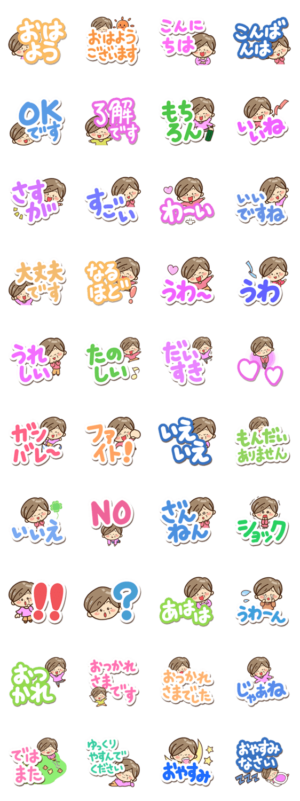 『おばあちゃんスタンプ』の見やすくて選びやすい【大文字】編です。『おばあちゃんスタンプ』の絵文字もあります。ばあばや、お母さん等のプレゼントにもぜひ。【かたこ】