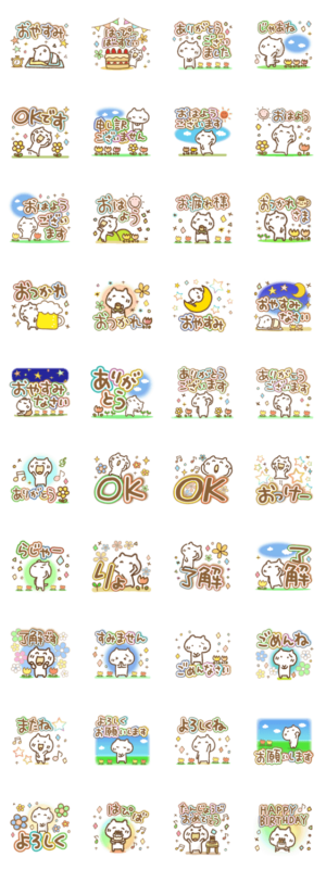 よく使う日常会話。OK、了解、おはよう、おやすみ、お疲れさまなど、それぞれ数パターンあるので、毎日使っても飽きません。