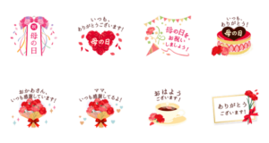おかあさんに、「いつもありがとう」の感謝を伝えるスタンプです。カーネーションの花束、バラのくすだま、ハートのフラワーアレンジメントなどでお祝い!マリコ より発売