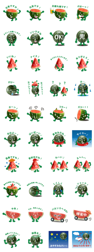 実写スイカに顔を付けたスイカ君です。見た目に夏を感じられるので、友達や家族みんなに使ってください。夏休みや暑中お見舞いなども入っています。すいか好きにも!なつき より発売