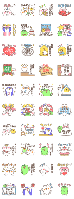 誕生日、結婚、出産、入学、卒業など、様々なイベントや記念日をお祝いしてくれる猫と仲間たちのスタンプです。ういむい より発売