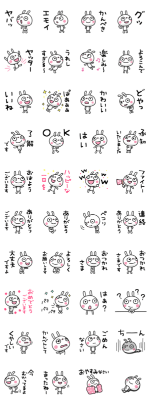 日常使いやすい、ふんわかウサギのスタンプ。「エモイ」「ヤバッ」から「ペコリ」まで。シンプル気分で、あなたの気持ちを届けてみよう。家族、学校、お仕事でも。