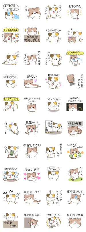 お疲れ気味やる気が出ない時に使えるゆるかわ三毛猫とキジトラ白猫のスタンプ第2弾 仕事 学校 締め切り 進捗 社畜 ソシャゲ 気づかい 定時 春夏秋冬つきしろ より発売