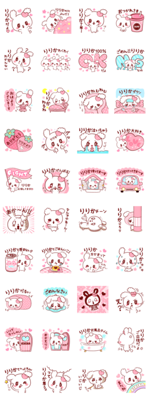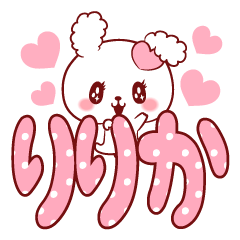 かわいいうさぎちゃんのりりかちゃんが使う名前スタンプ。りりか、リリカ、梨々香、梨々華、凜々花、李里花、璃々花、璃々香、里々香、里利香、莉々香のなまえの方どうぞ。しらたまごはん より発売